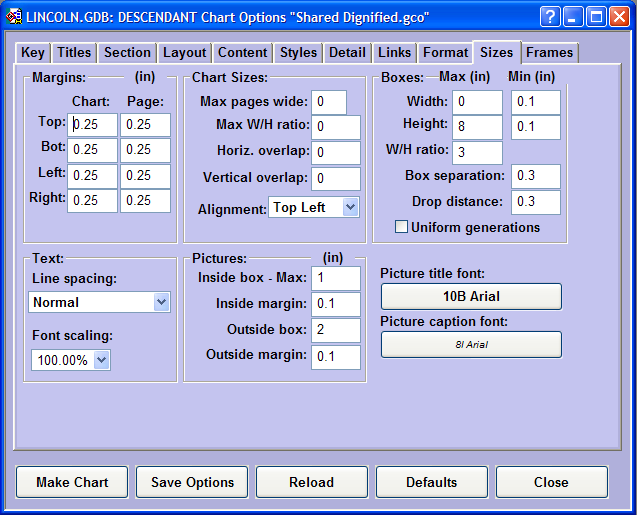 The Sizes page is an important tool for controlling the overall size of the chart. You will find that changing settings on this page can affect the size of your chart dramatically. Not only the size, but the aspect ratio can be altered. If your chart is too short and wide, you can make it taller and narrower.