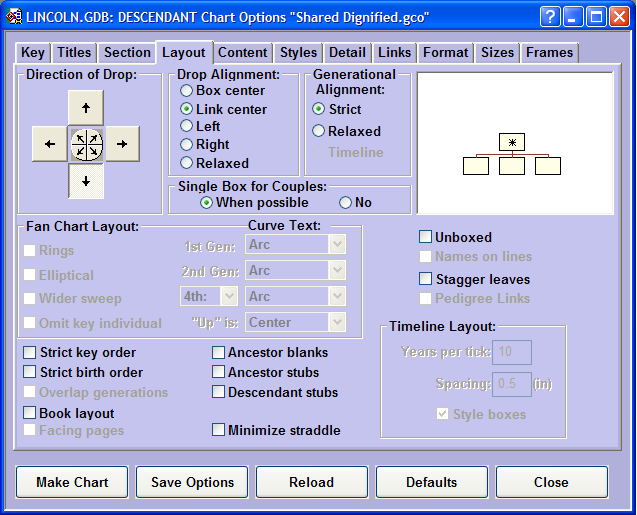Setting Generational alignment to Relaxed will permit boxes to be drawn either higher or lower than other boxes of the same generational row, or left or right of a generational column. Setting the Generational alignment to Timeline will select a timeline chart layout.