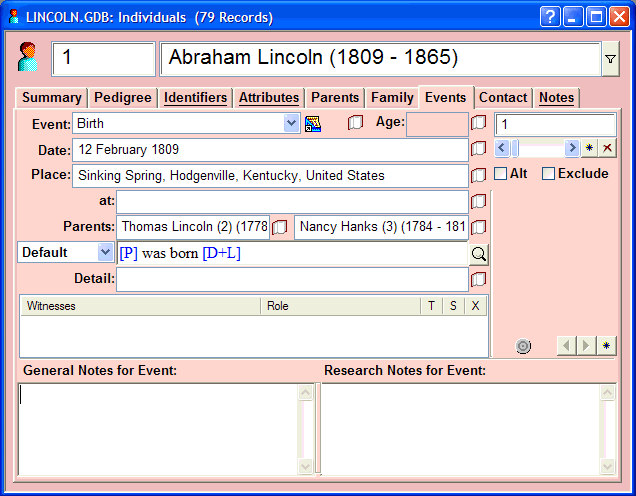 The Events page is perhaps the central focus of the Genbox program. It is here that the details of all events are entered and viewed. One event record is shown at a time. For each event record, you can enter: