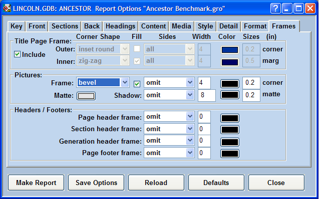 As the finishing touch, frames can be added to the title page, pictures, and headings. Frames are excellent for setting off an item from its surroundings, adding color and drawing attention. Frame choices include corner shape, corner fill, sides to include, pixel width, color, corner size, margin size, matte, shading, and shadow. These options are set on the Frames page.